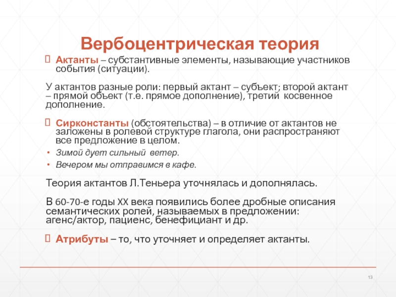 Теория актантов Л.Теньера уточнялась и дополнялась.