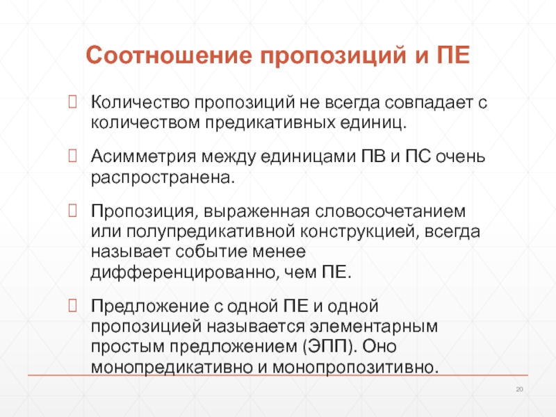 Предложение с одной ПЕ и одной пропозицией называется элементарным простым предложением (ЭПП). Оно монопредикативно и монопропозитивно.