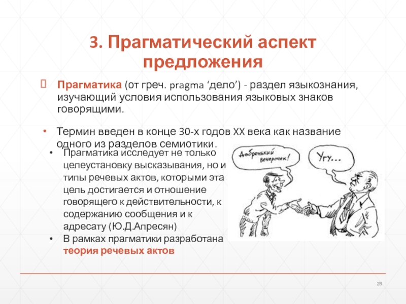 Прагматика исследует не только целеустановку высказывания, но и типы речевых актов, которыми эта цель достигается и отношение говорящего к действительности, к содержанию сообщения и к адресату (Ю.Д.Апресян)