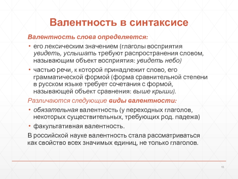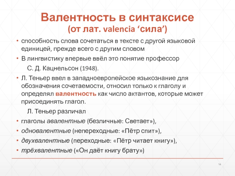 Л. Теньер ввел в западноевропейское языкознание для обозначения сочетаемости, относил только к глаголу и определял валентность как число актантов, которые может присоединять глагол.