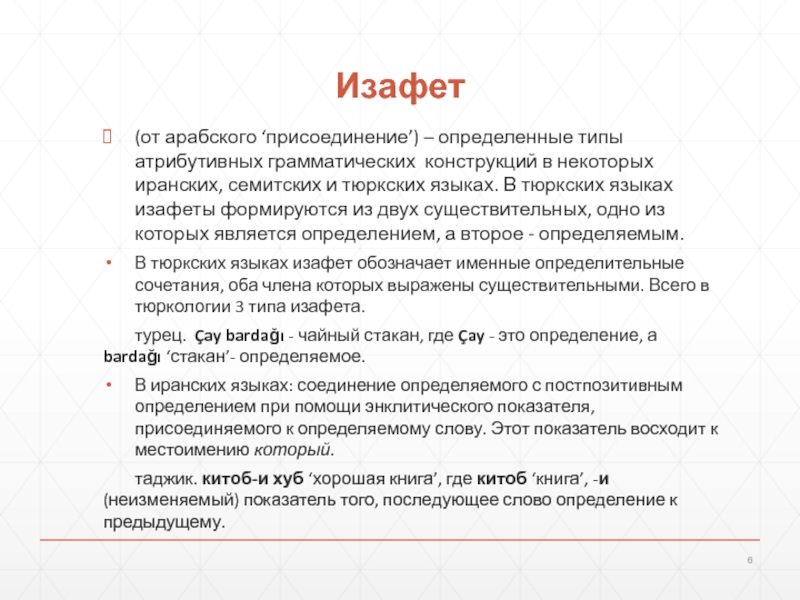 некоторых иранских, семитских и тюркских языках. В тюркских языках изафеты