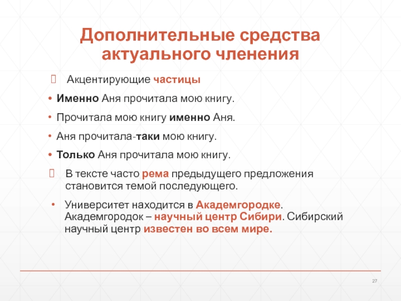 порядок слов (тема обычно помещается в начале фразы, а рема — в конце)