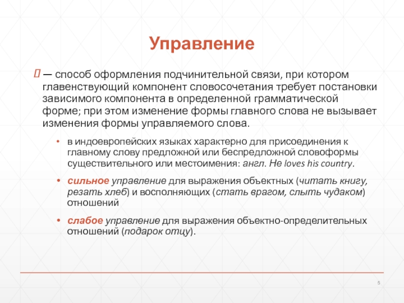 требует постановки зависимого компонента в определенной грамматической форме; при этом
