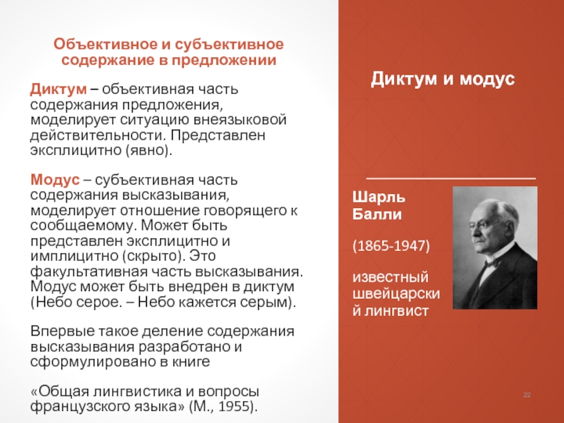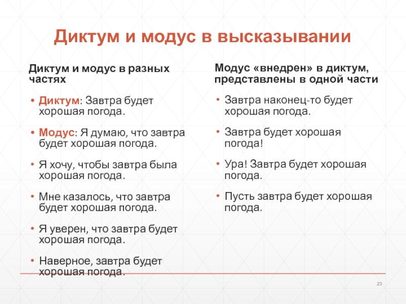 – субъективная часть содержания высказывания, моделирует отношение говорящего к сообщаемому. Может быть представлен эксплицитно и имплицитно (скрыто). Это факультативная часть высказывания. Модус может быть внедрен в диктум (Небо серое. – Небо кажется серым).