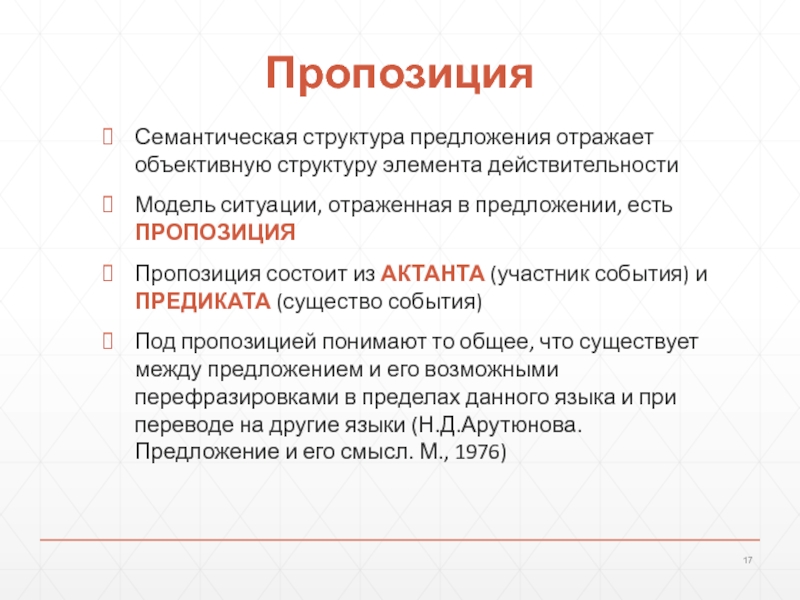 Под пропозицией понимают то общее, что существует между предложением и его возможными перефразировками в пределах данного языка и при переводе на другие языки (Н.Д.Арутюнова. Предложение и его смысл. М., 1976)