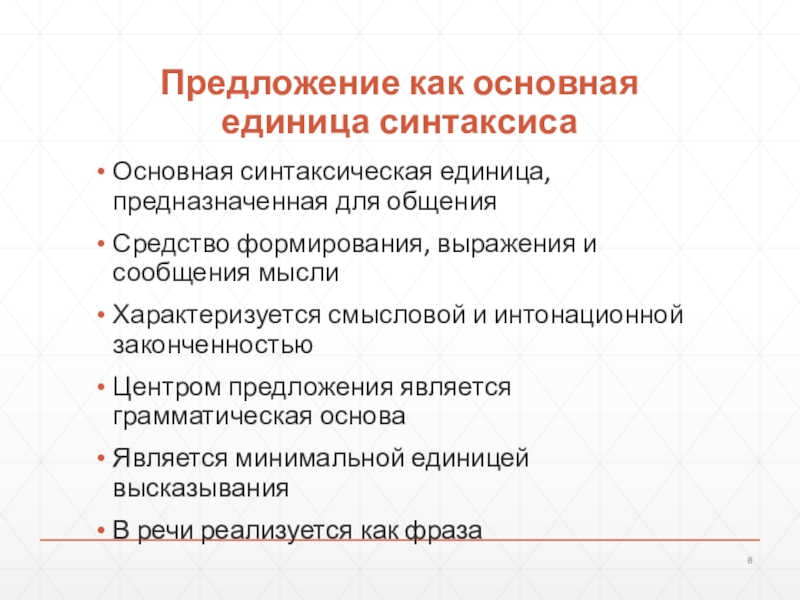 Предложение - это оформленная по закону данного языка целостная единица речи, служащая главным средством формирования, выражения и сообщения мысли (В.В.Виноградов). Выполняет коммуникативную и номинативную функции.