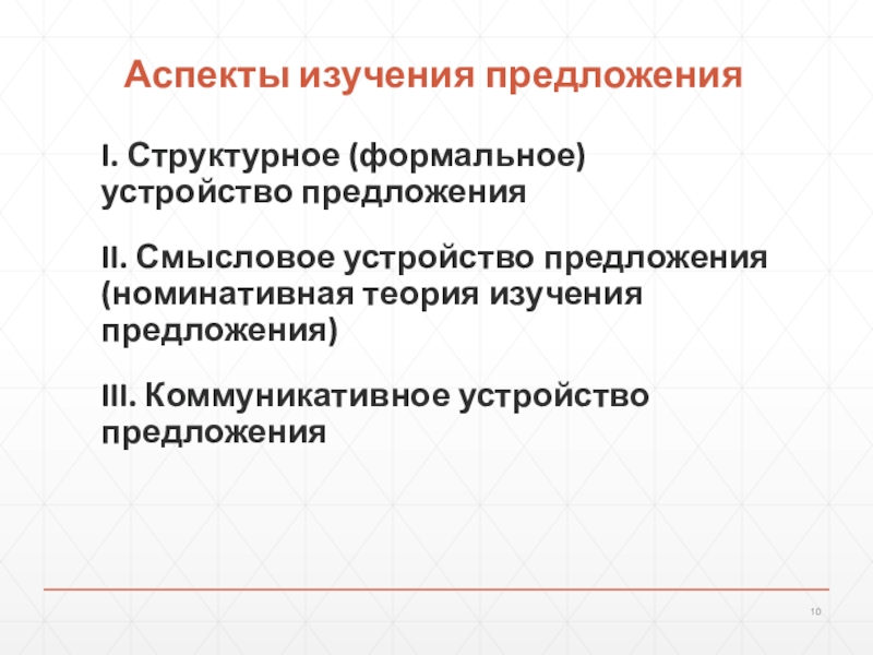 Синтаксис предложения изучает формальное, семантическое и коммуникативное устройство разных по сложности предложений.