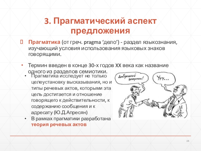 Прагматика исследует не только целеустановку высказывания, но и типы речевых актов, которыми эта цель достигается и отношение говорящего к действительности, к содержанию сообщения и к адресату (Ю.Д.Апресян)