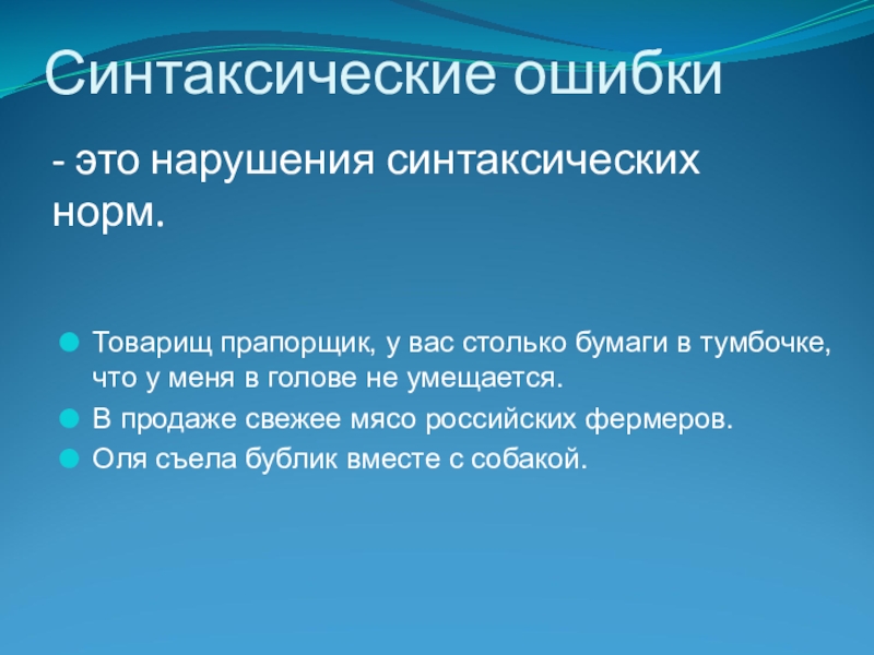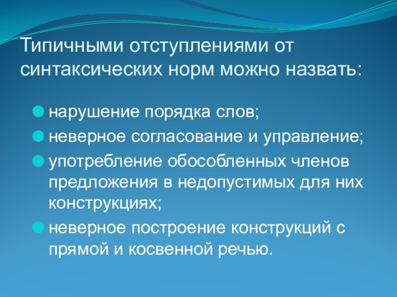 Слайд 10Типичными отступлениями от синтаксических норм можно назвать: