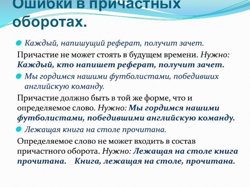 Слайд 20Ошибки в причастных оборотах.
