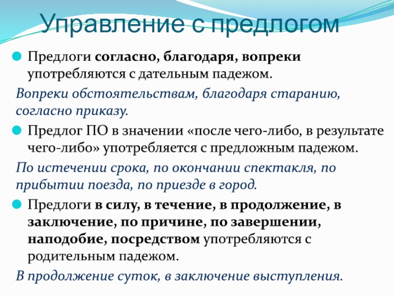 обстоятельствам, благодаря старанию, согласно приказу.