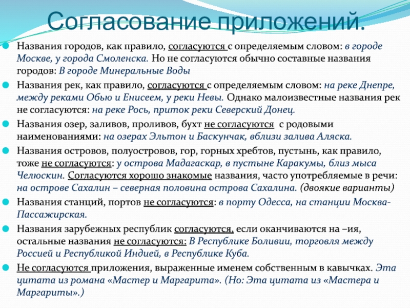 Названия островов, полуостровов, гор, горных хребтов, пустынь, как правило, тоже не согласуются: у острова Мадагаскар, в пустыне Каракумы, близ мыса Челюскин. Согласуются хорошо знакомые названия, часто употребляемые в речи: на острове Сахалин – северная половина острова Сахалина. (двоякие варианты)