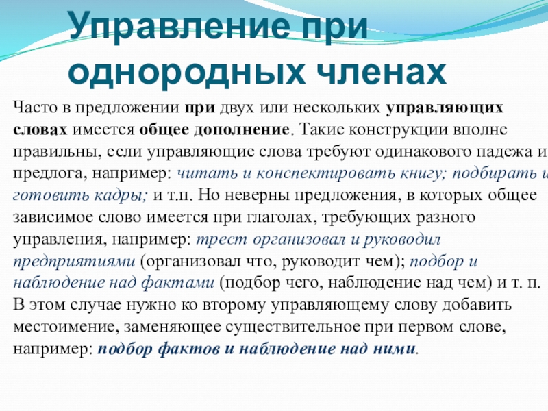 управляющие слова требуют одинакового падежа и предлога, например: читать и конспектировать книгу; подбирать и готовить кадры; и т.п. Но неверны предложения, в которых общее зависимое слово имеется при глаголах, требующих разного управления, например: трест организовал и руководил предприятиями (организовал что, руководит чем); подбор и наблюдение над фактами (подбор чего, наблюдение над чем) и т. п. В этом случае нужно ко второму управляющему слову добавить местоимение, заменяющее существительное при первом слове, например: подбор фактов и наблюдение над ними.
