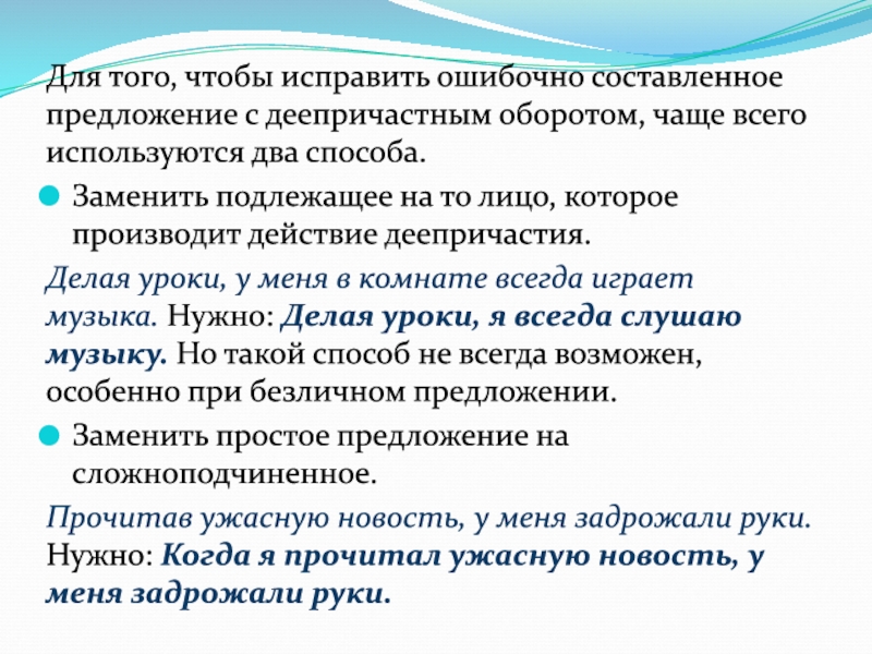 Слайд 23Для того, чтобы исправить ошибочно составленное предложение с деепричастным оборотом,
