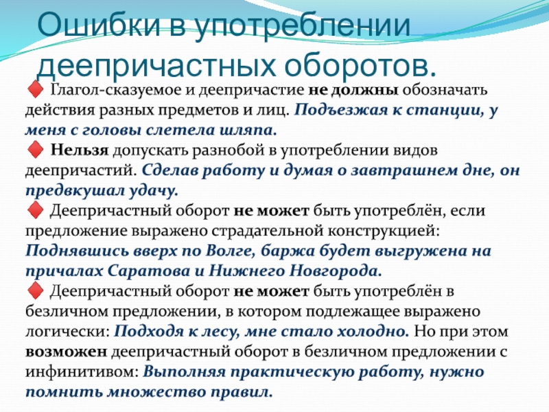 ♦ Деепричастный оборот не может быть употреблён в безличном предложении, в котором подлежащее выражено логически: Подходя к лесу, мне стало холодно. Но при этом возможен деепричастный оборот в безличном предложении с инфинитивом: Выполняя практическую работу, нужно помнить множество правил.