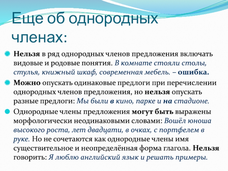 Нельзя в ряд однородных членов предложения включать
