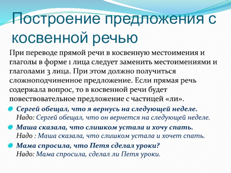 и глаголами 3 лица. При этом должно получиться сложноподчиненное предложение. Если прямая речь содержала вопрос, то в косвенной речи будет повествовательное предложение с частицей «ли».