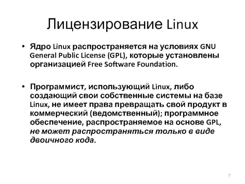 создающий свои собственные системы на базе Linux, не имеет права превращать свой продукт в коммерческий (ведомственный); программное обеспечение, распространяемое на основе GPL, не может распространяться только в виде двоичного кода.
