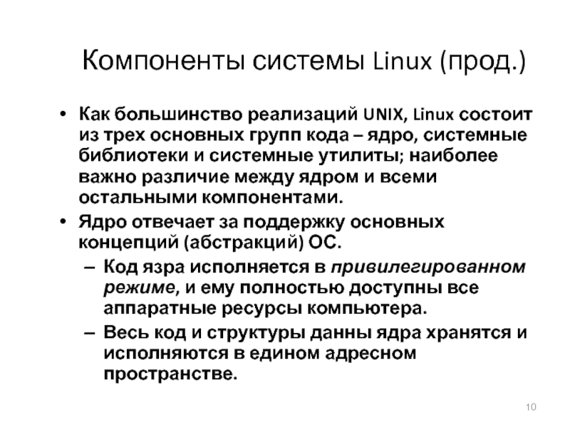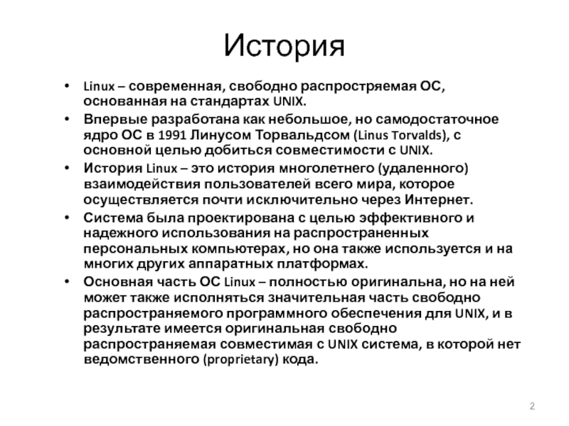 Основная часть ОС Linux – полностью оригинальна, но на ней может также исполняться значительная часть свободно распространяемого программного обеспечения для UNIX, и в результате имеется оригинальная свободно распространяемая совместимая с UNIX система, в которой нет ведомственного (proprietary) кода.