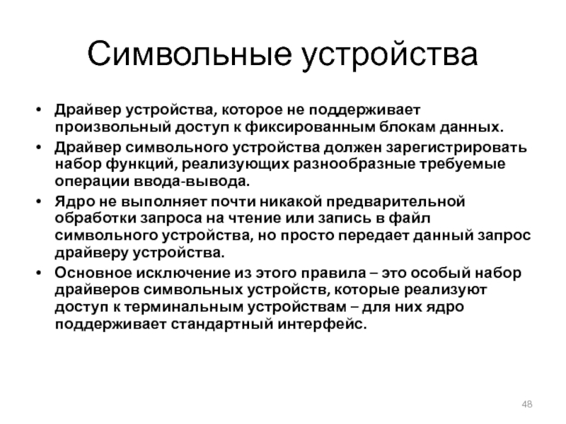 Основное исключение из этого правила – это особый набор драйверов символьных устройств, которые реализуют доступ к терминальным устройствам – для них ядро поддерживает стандартный интерфейс.