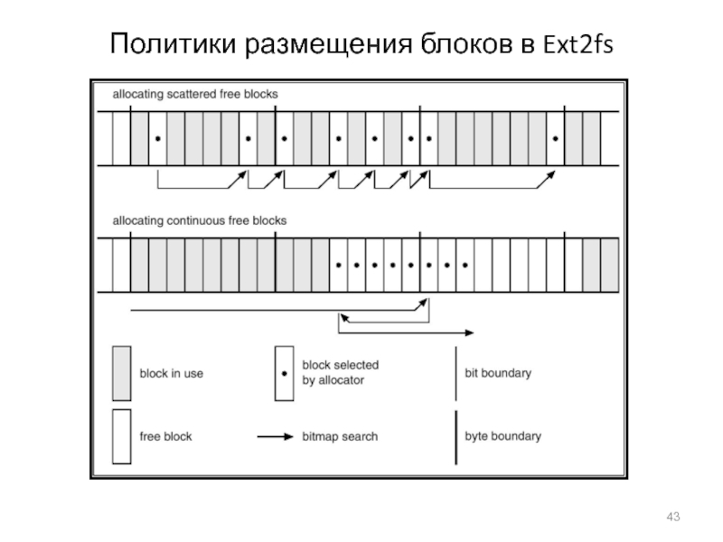 Ext2fs использует политики распределения, спроектированные с целью размещения логически смежных блоков файла в физически смежных блоках на диске, так чтобы можно было использовать одну операцию ввода-вывода для нескольких смежных блоков.