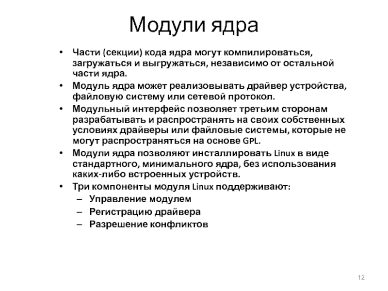 Модули ядра позволяют инсталлировать Linux в виде стандартного, минимального ядра, без использования каких-либо встроенных устройств.