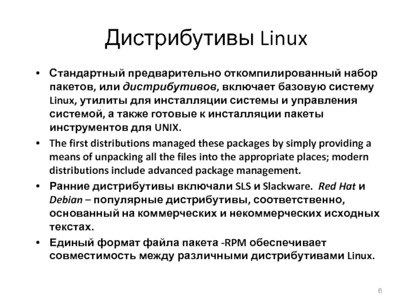 Ранние дистрибутивы включали SLS и Slackware. Red Hat и Debian – популярные дистрибутивы, соответственно, основанный на коммерческих и некоммерческих исходных текстах.