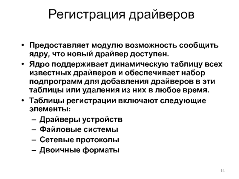 Драйвер символьного устройства должен зарегистрировать набор функций, реализующих разнообразные