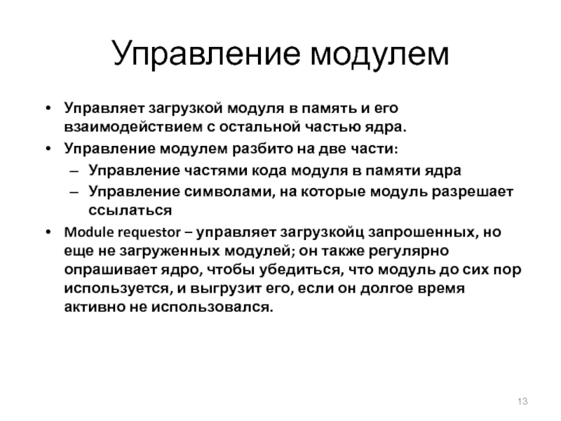 Поддержку внутренних потоков (threads) ядра ОС, для обработки зависимостей между загрузочными модулями, и для автоматической загрузки модулей по требованию.