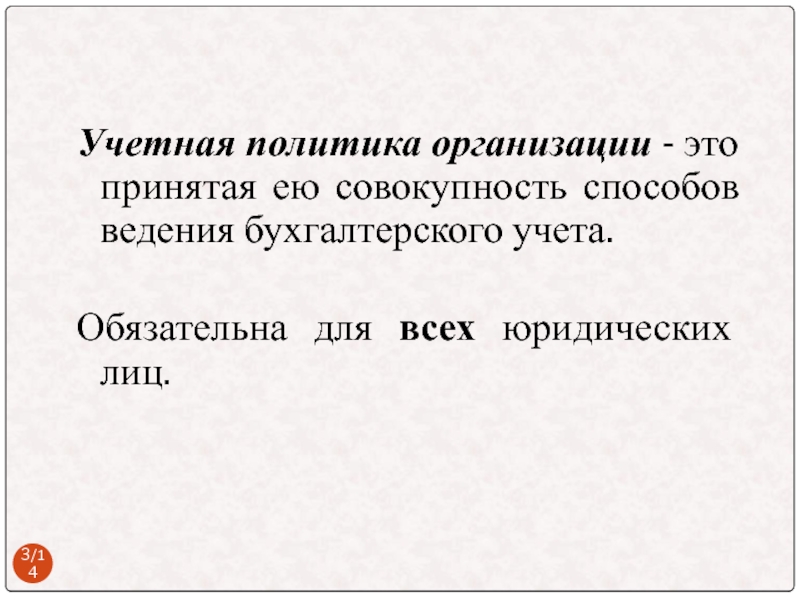 Учетная политика организации - это принятая ею совокупность способов ведения бухгалтерского учета.Обязательна для всех юридических лиц./14