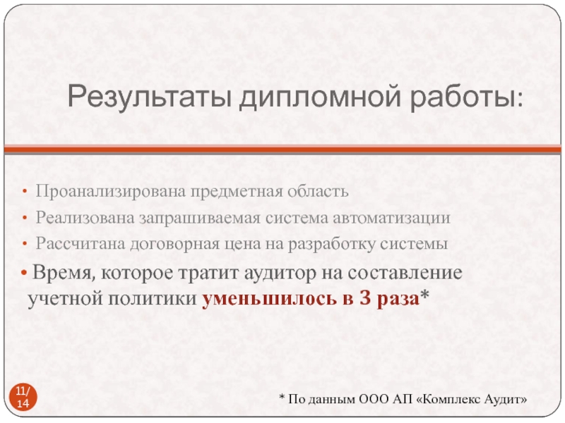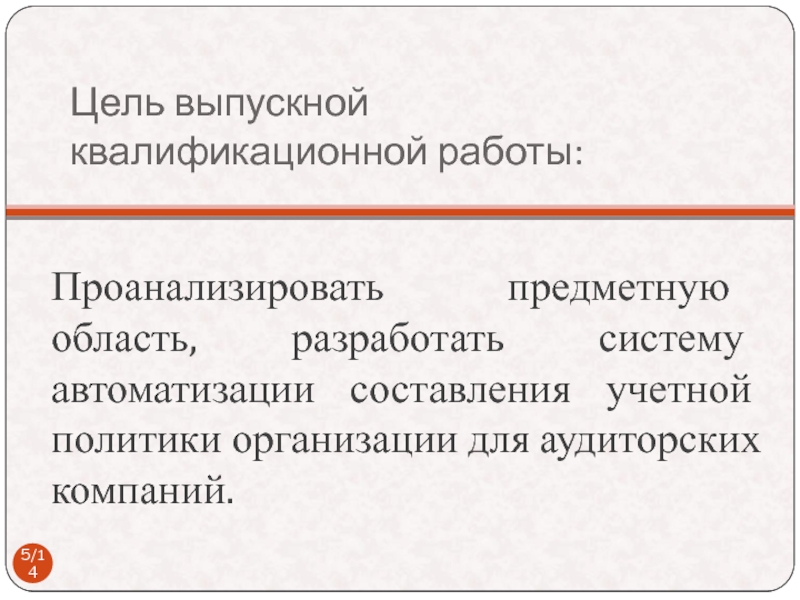 Цель выпускной  квалификационной работы:Проанализировать предметную область, разработать систему автоматизации составления учетной политики организации для аудиторских компаний./14