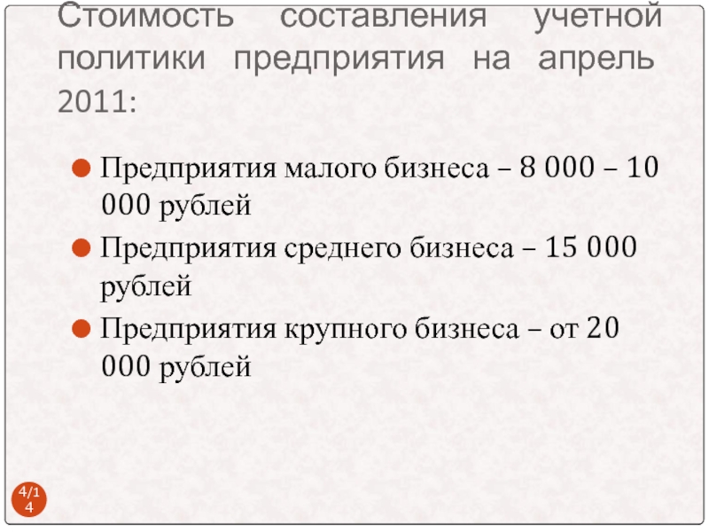 Слайд 4Стоимость составления учетной политики предприятия на апрель 2011: