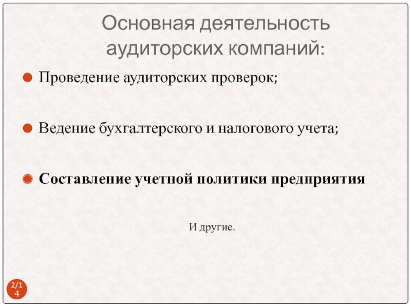 Основная деятельность аудиторских компаний:Проведение аудиторских проверок;Ведение бухгалтерского и налогового учета;Составление учетной политики предприятияИ другие.2/14
