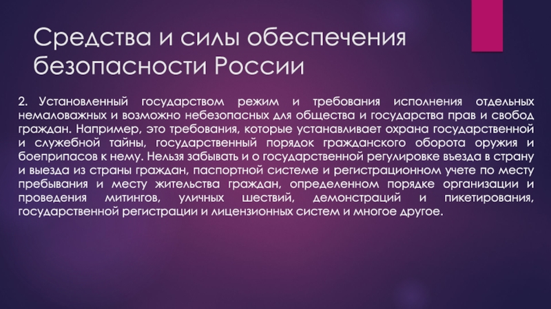 прав и свобод граждан. Например, это требования, которые устанавливает охрана государственной и служебной тайны, государственный порядок гражданского оборота оружия и боеприпасов к нему. Нельзя забывать и о государственной регулировке въезда в страну и выезда из страны граждан, паспортной системе и регистрационном учете по месту пребывания и месту жительства граждан, определенном порядке организации и проведения митингов, уличных шествий, демонстраций и пикетирования, государственной регистрации и лицензионных систем и многое другое.