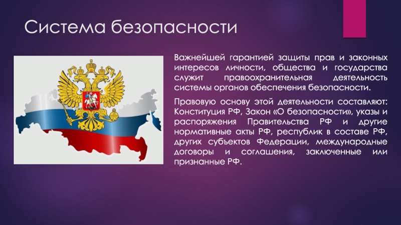 этой деятельности составляют: Конституция РФ, Закон «О безопасности», указы и распоряжения Правительства РФ и другие нормативные акты РФ, республик в составе РФ, других субъектов Федерации, международные договоры и соглашения, заключенные или признанные РФ.