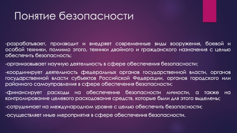 сфере безопасности, определяются основные направления деятельности органов государственной власти и управления в данной области, формируются или преобразуются органы обеспечения безопасности и механизм контроля и надзора за их деятельностью.