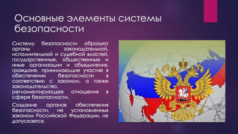 Создание органов обеспечения безопасности, не установленных законом Российской Федерации, не допускается.