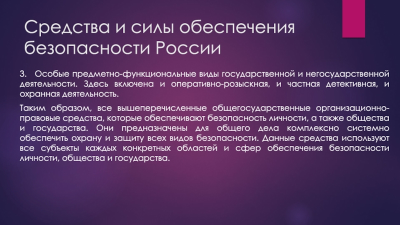 Таким образом, все вышеперечисленные общегосударственные организационно-правовые средства, которые обеспечивают безопасность личности, а также общества и государства. Они предназначены для общего дела комплексно системно обеспечить охрану и защиту всех видов безопасности. Данные средства используют все субъекты каждых конкретных областей и сфер обеспечения безопасности личности, общества и государства.