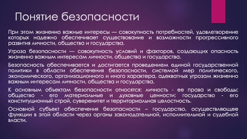 При этом жизненно важные интересы — совокупность потребностей, удовлетворение которых надежно обеспечивает существование и возможности прогрессивного развития личности, общества и государства.