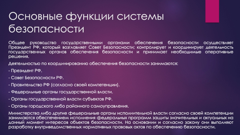 Основной субъект обеспечения безопасности – государство, осуществляющее функции в этой области через органы законодательной, исполнительной и судебной власти.