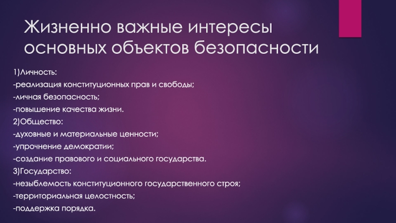 К основным объектам безопасности относятся: личность - ее права и свободы; общество - его материальные и духовные ценности; государство - его конституционный строй, суверенитет и территориальная целостность.
