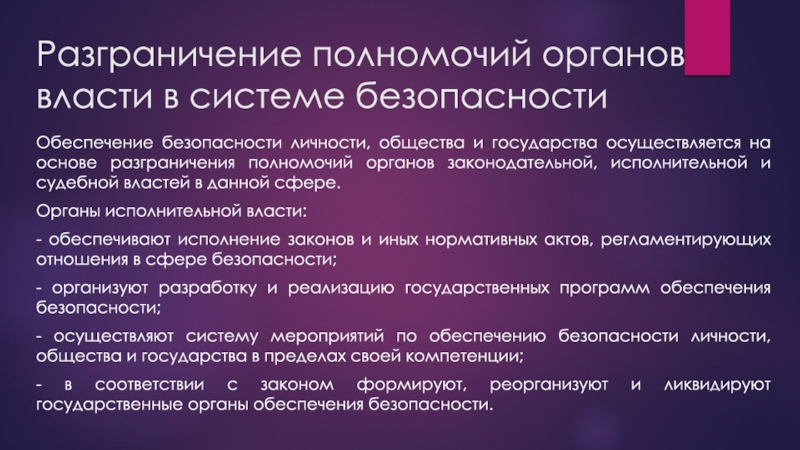 Слайд 15Разграничение полномочий органов власти в системе безопасности