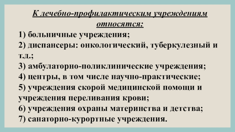 Слайд 21К лечебно-профилактическим учреждениям относятся: