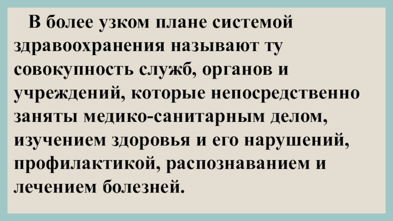 Слайд 4В более узком плане системой здравоохранения называют ту совокупность служб,