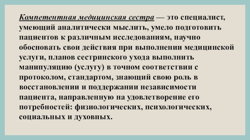 Слайд 10Компетентная медицинская сестра — это специалист, умеющий аналитически мыслить, умело