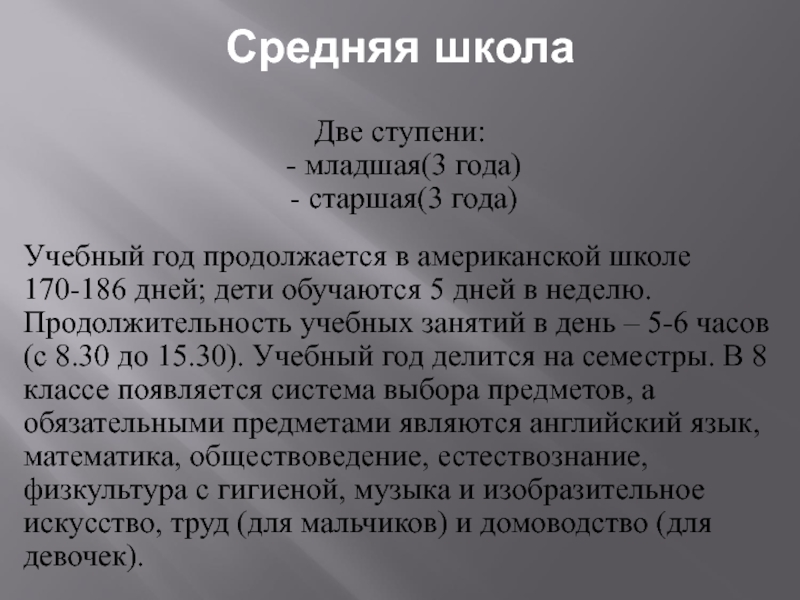 Учебный год пpодолжается в амеpиканской школе 170-186 дней; дети обучаются