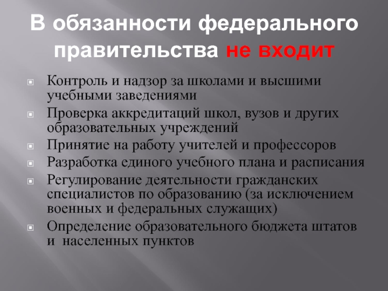 Слайд 18В обязанности федерального правительства не входит