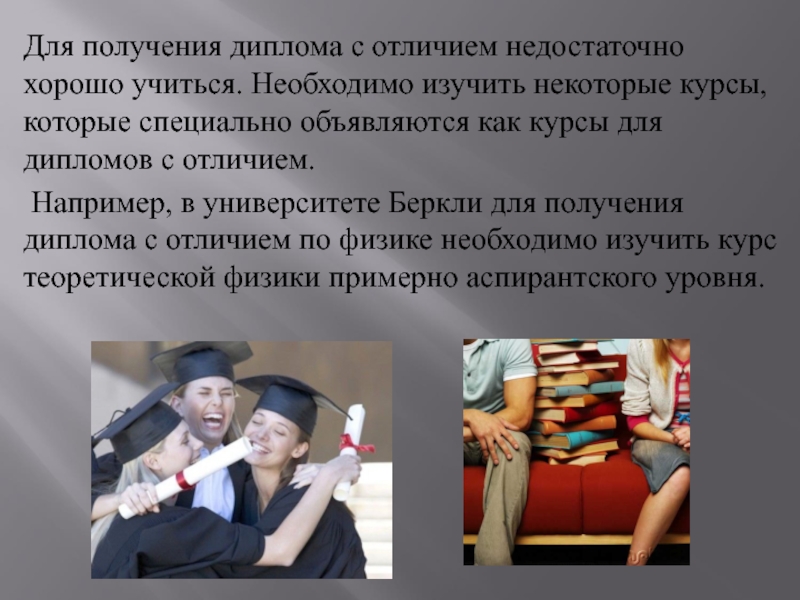 Например, в университете Беркли для получения диплома с отличием по физике необходимо изучить курс теоретической физики примерно аспирантского уровня.