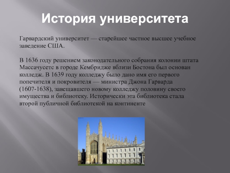 в городе Кембридже вблизи Бостона был основан колледж. В 1639 году колледжу было дано имя его первого попечителя и покровителя — министра Джона Гарварда (1607-1638), завещавшего новому колледжу половину своего имущества и библиотеку. Исторически эта библиотека стала второй публичной библиотекой на континенте