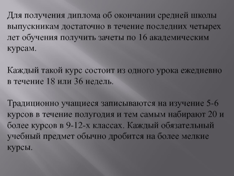 Традиционно учащиеся записываются на изучение 5-6 курсов в течение полугодия и тем самым набирают 20 и более курсов в 9-12-х классах. Каждый обязательный учебный предмет обычно дробится на более мелкие курсы.